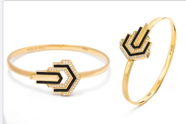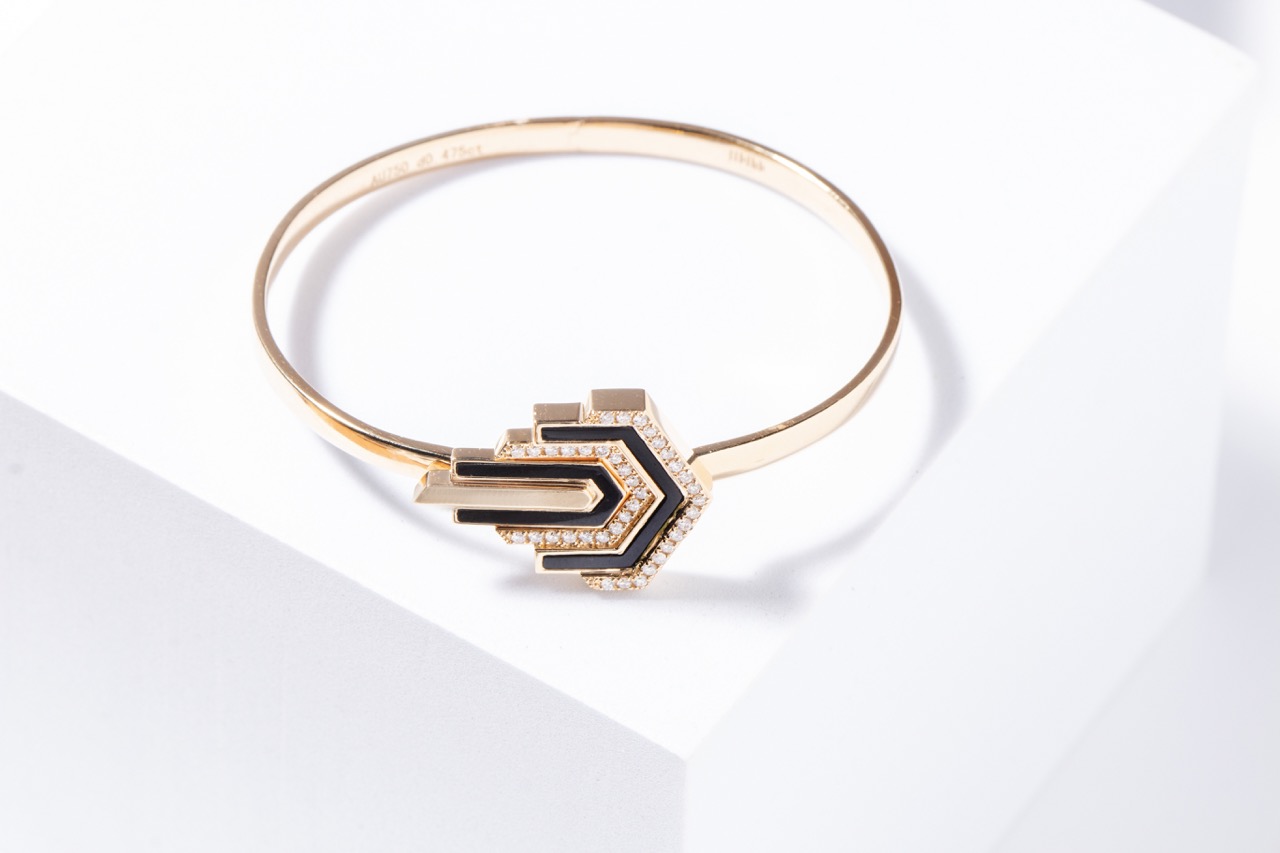 18k gold pendant necklace with natural gemstones and white diamonds and geometric shape That are inspired from light.