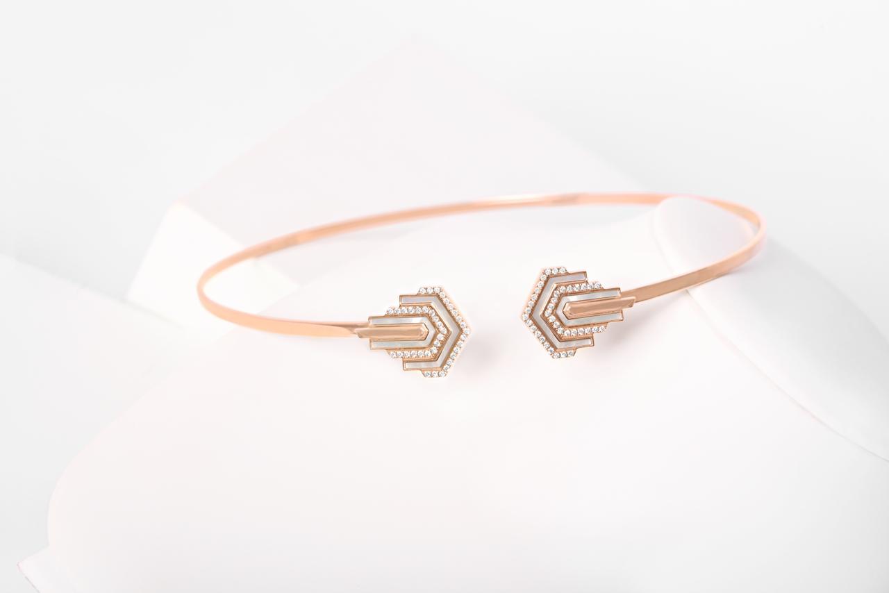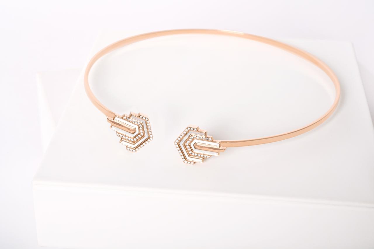 18k gold pendant necklace with natural gemstones and white diamonds and geometric shape That are inspired from light.