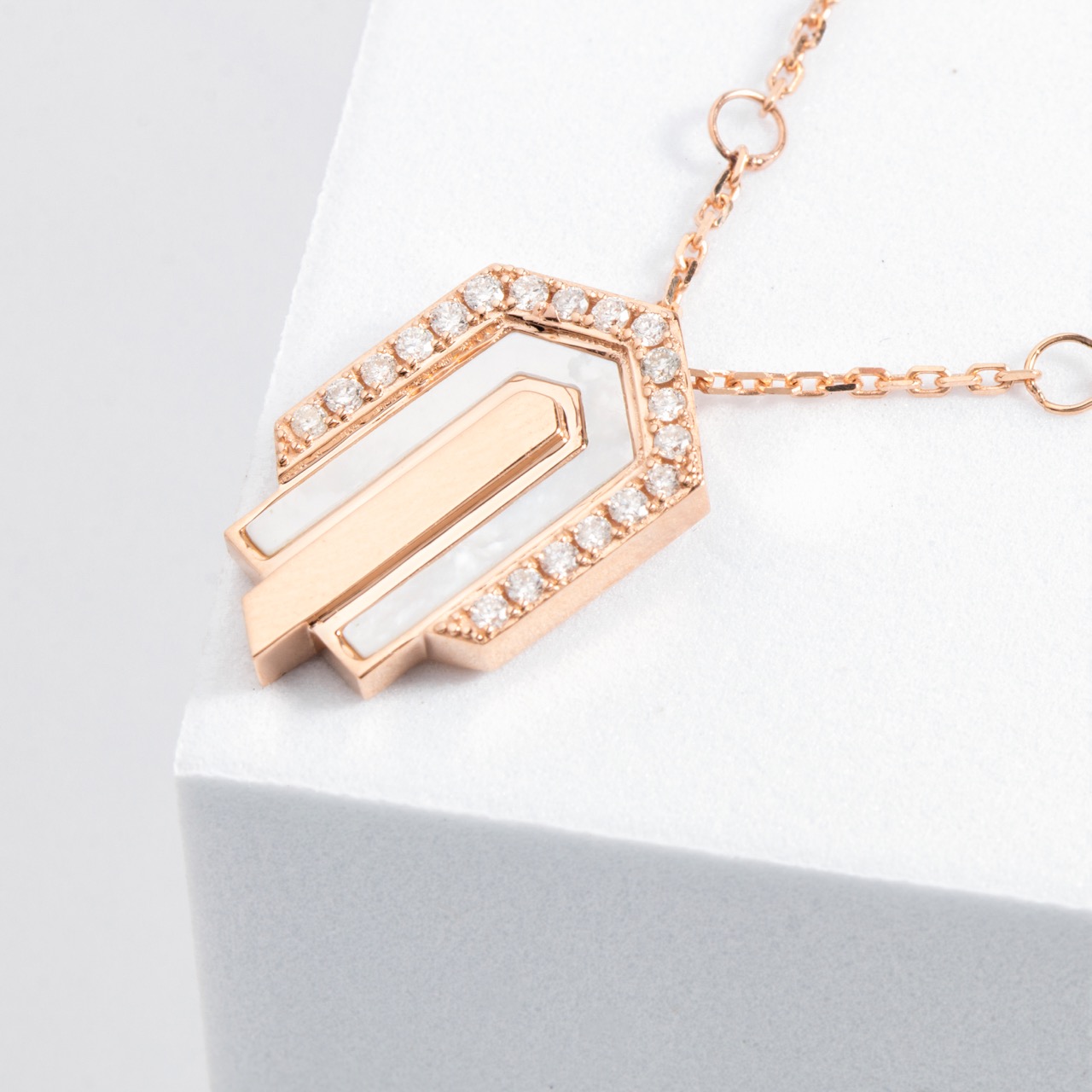18k gold pendant necklace with natural gemstones and white diamonds and geometric shape That are inspired from light.