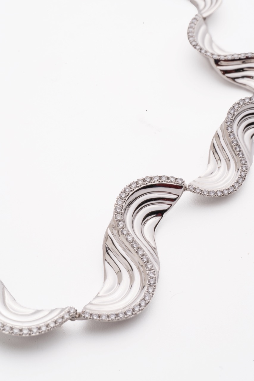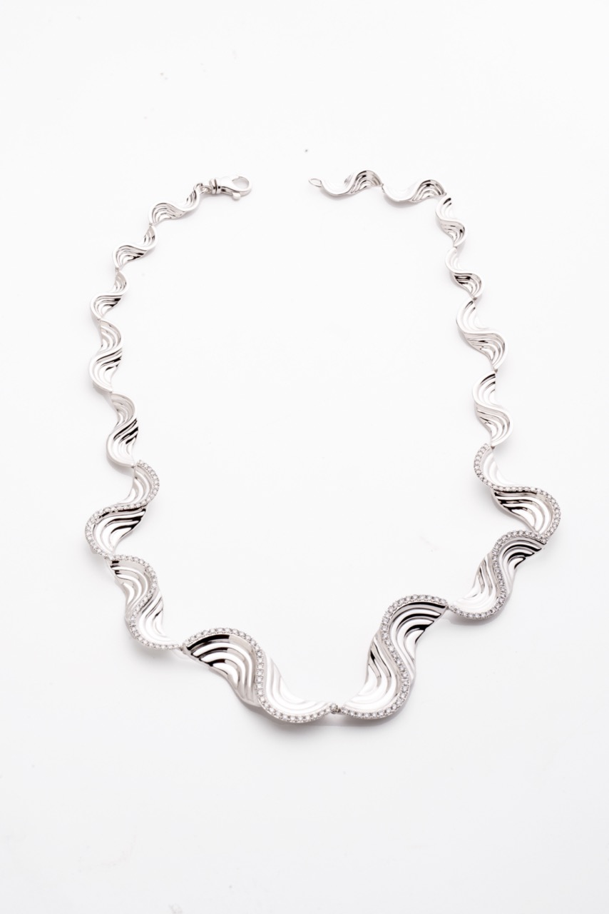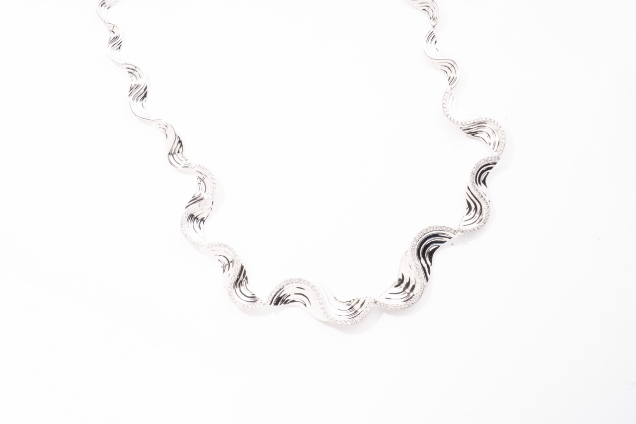 An outstanding jewellery necklace piece18k gold & white natural diamonds with a movement technique that represents sea waves beauty